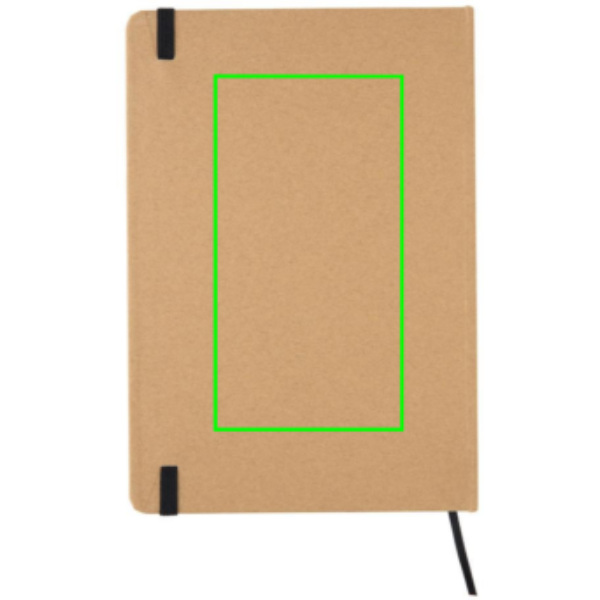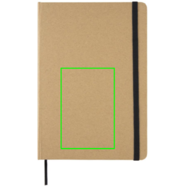 Notizbuch mit recyceltem Papier ( 72 Blätter /144 Seiten mit crèmefarbenem, liniertem 70g/m2 ) und einem Cover aus Kraft-Pappe. Das Notizbuch verfügt über ein elastisches Verschlussband und ein Lesezeichenband.