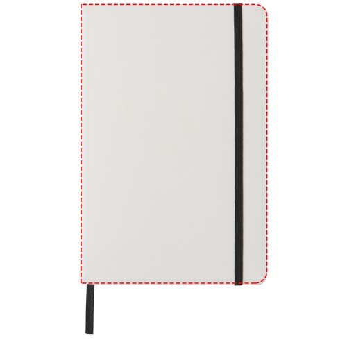 Weißes A5 Notizbuch mit farbigem Gummizug und Lesebändchen. Enthält 80 Blatt (60 g/m²) liniertes Papier.