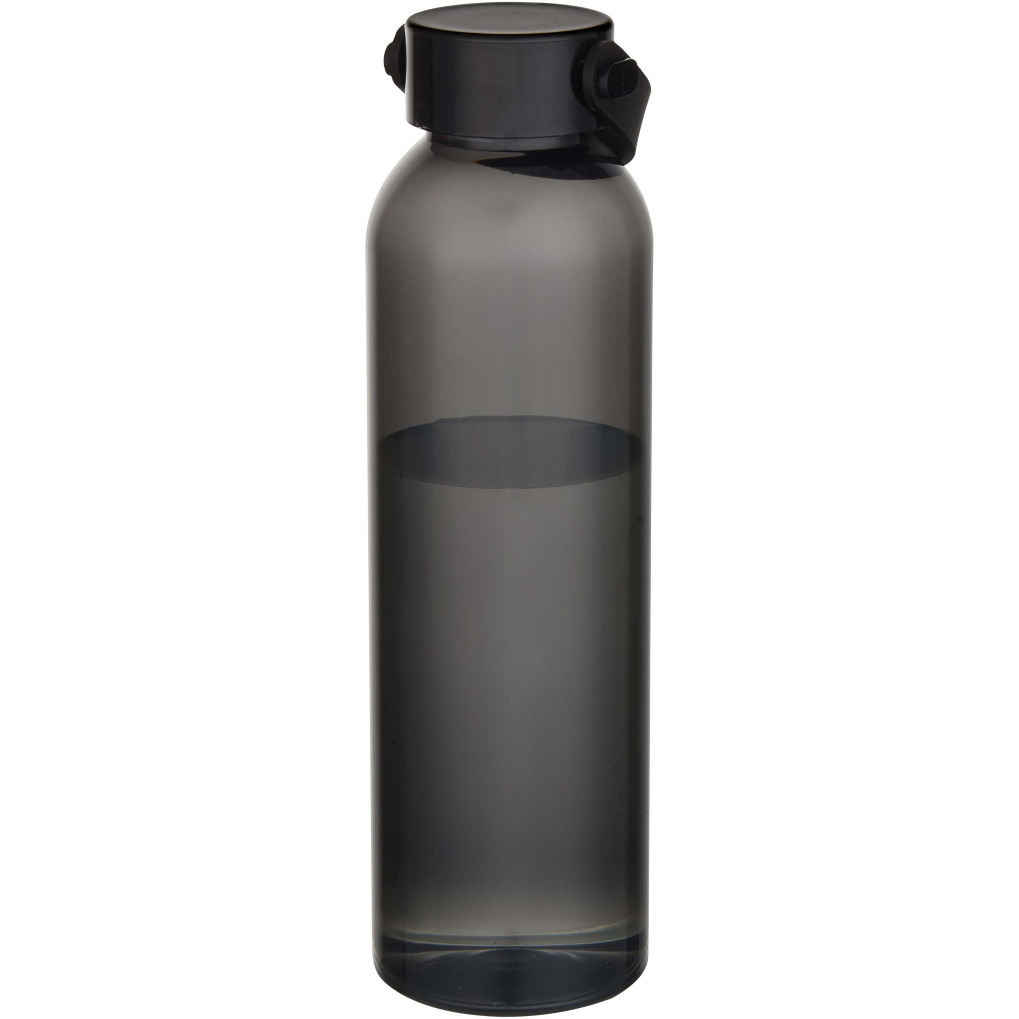Water bottle made from RCS certified RPET, featuring a convenient silicone carry handle. In compliance with the EFSA approved PET recycling process. Volume capacity: 630 ml.