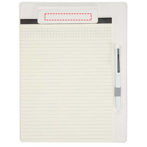 The Clast clipboard combines a sleek PU leather design with practical features for both meetings and everyday use. It fits standard A4 pages and includes a magnetic clip, stitched edges, and a built-in pen loop. Inside are 26 lined sheets of 65 g/m² paper along with a ballpoint pen made with a recycled plastic upper barrel and an RCS certified recycled aluminium lower barrel. The Juana ballpoint pen is also available separately. Clipboard size: 25.5 × 33 cm. Pen ink colour: black.