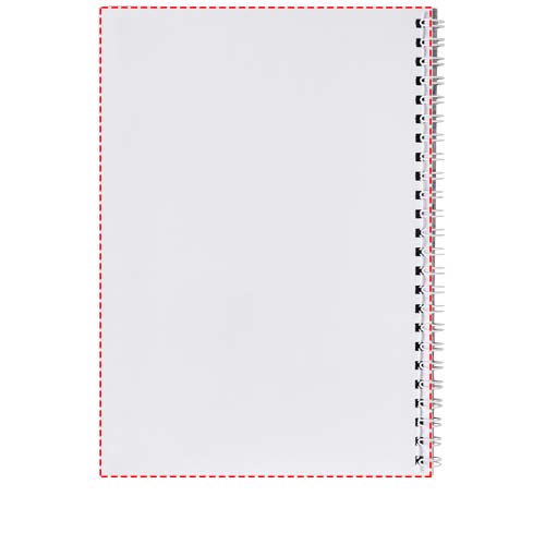 This A4 notebook includes a white or black wire, 80 g/m2 blank paper, and a glossy card front and back cover (250 g/m2). The standard model is delivered with 50 sheets, but the notebook is also available with 80 sheets. Printing is possible on the sheets as well as the front and back covers.