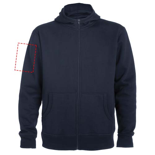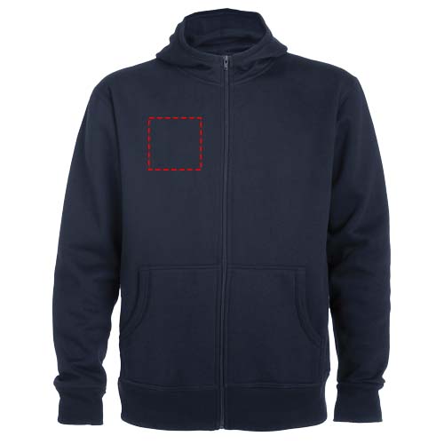 Sweat hooded jacket with high neck and full zip. Ribbed detail in hood and pocket piping. Kangaroo style pocket. 2x2 rib in cuffs and waist. Removable label. The model is 184 cm and is wearing size L.