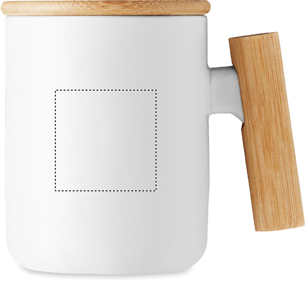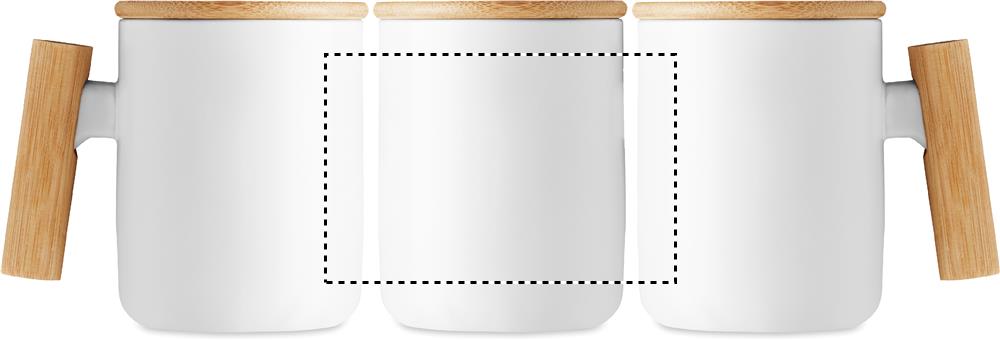 Porcelain mug with bamboo lid and handle. Capacity: 380 ml. Bamboo is a natural product, there may be slight variations in colour and size per item, which can affect the final decoration outcome.