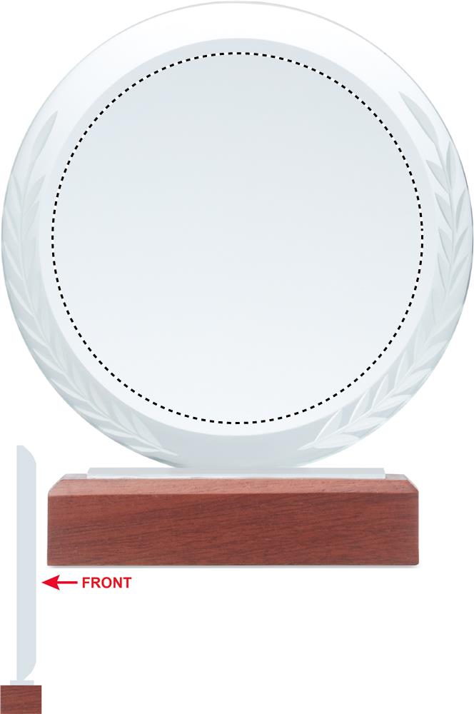 Round crystal award or memorial plaque on a beech wooden base in a gift box.
