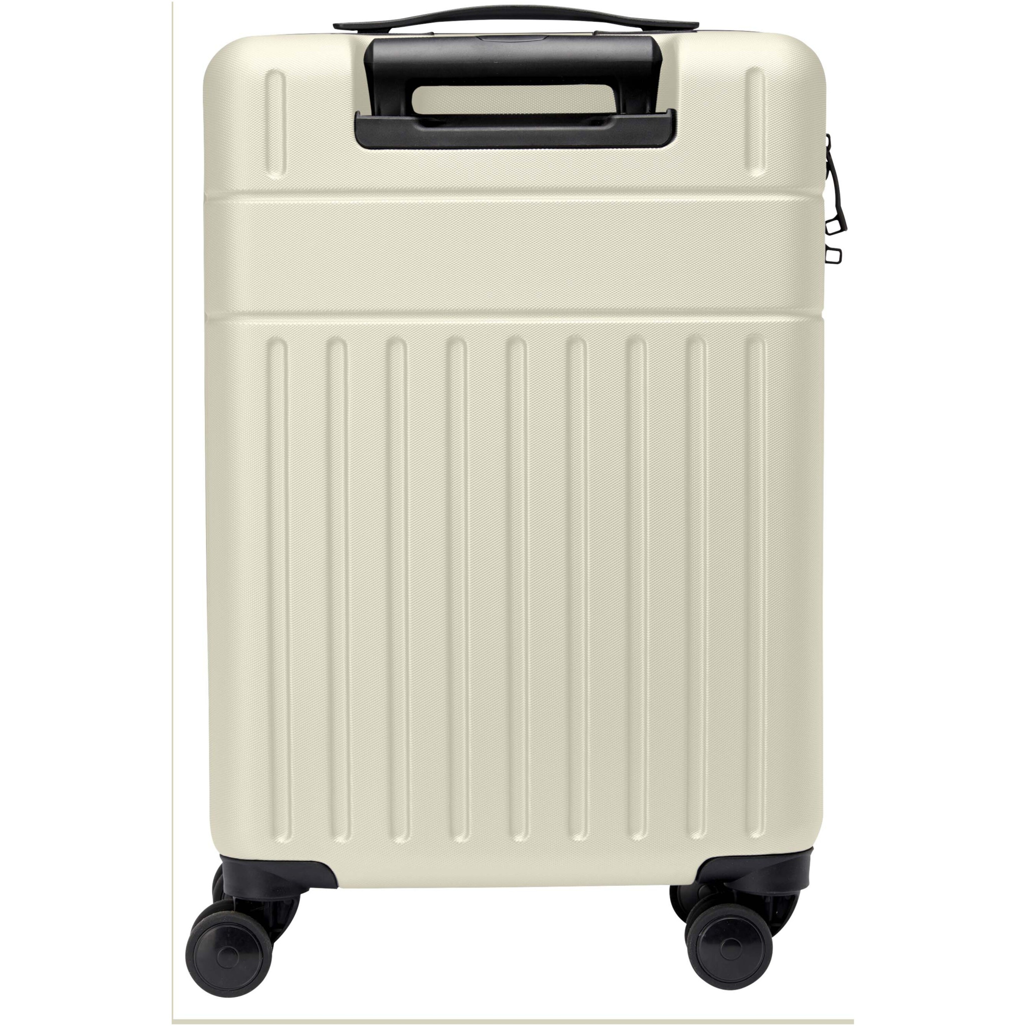 Constructed with impact-resistant recycled plastic and RPET lining, the 20” Rover cabin trolley stands for sustainability as much as quality. It features a double-tube aluminium frame, 360 degree 4-wheel spinner, an integrated TSA combination lock, an easy grab handle for comfort, and interior divider organiser compartments. Can be brought as hand luggage on most mainstream airlines. This trolley is GRS certified, including the printing, making it a more sustainable choice.