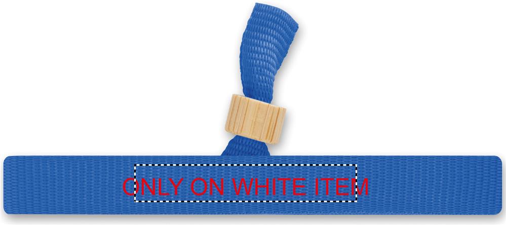 300D RPET polyester event wristband with bamboo ring closure. Wristband size 34 cm and 1,5 cm wide. Bamboo is a natural product, there may be slight variations in colour and size per item, which can affect the final decoration outcome.