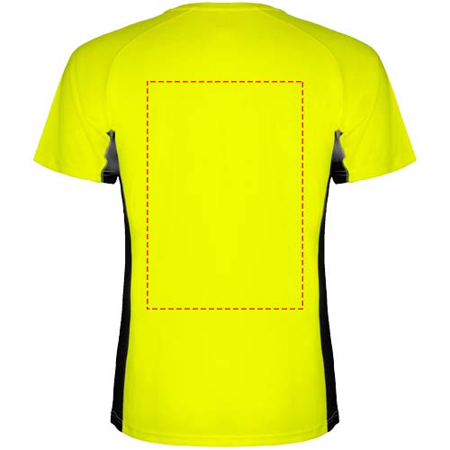 Technical and breathable fabric. A combination of two polyester fabrics: Main fabric in birds eye, side panels and inner sleeve in microperforated fabric. Crew neck with inner reinforced covered seams. Removable label.