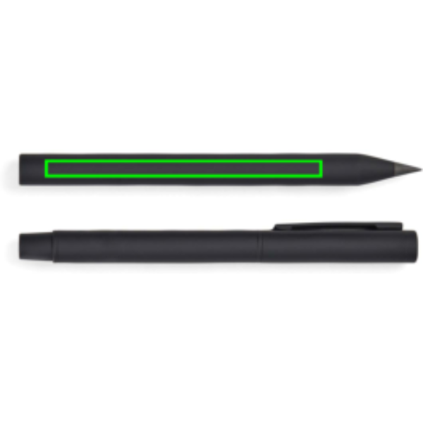 This modern and sleek set includes two pens: an eternal pen and a classic ballpoint pen with a cap and clip. Designed for both style and functionality, these pens are crafted from RCS certified recycled stainless steel, featuring a rubber surface coating for a comfortable grip and a matt finish. Both pens have a balanced weight that ensures stability and effortless writing. The eternal pen offers limitless writing. The ballpoint pen features a fine 1.00 mm tip and provides smooth, consistent writing with documental blue ink, lasting up to 1200 metres. Certified by RCS (Recycled Claim Standard), RCS certification guarantees that the entire supply chain of recycled materials is certified. The total recycled content is based on the overall product weight. This product contains 52% RCS certified recycled aluminum and 10% RCS certified stainless steel.