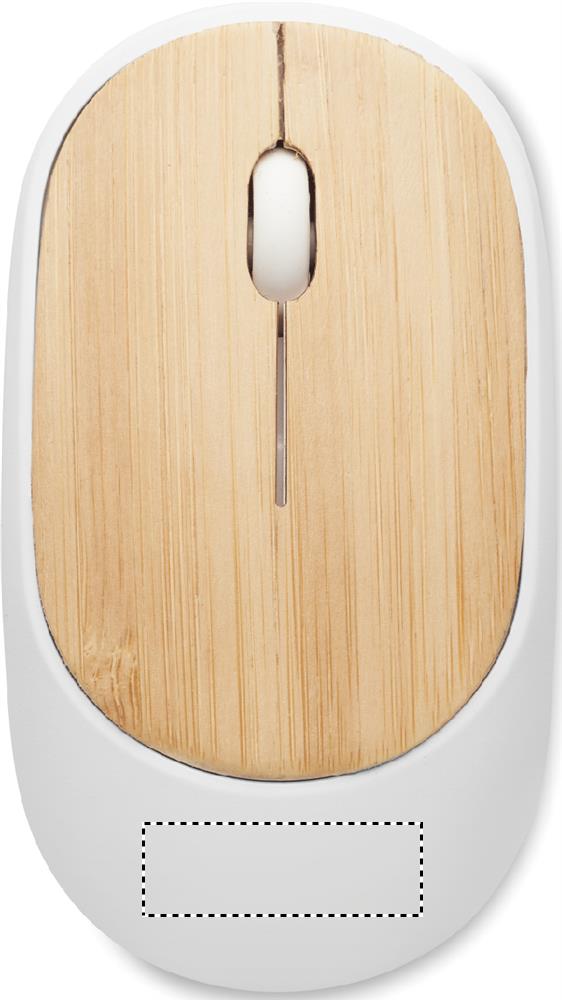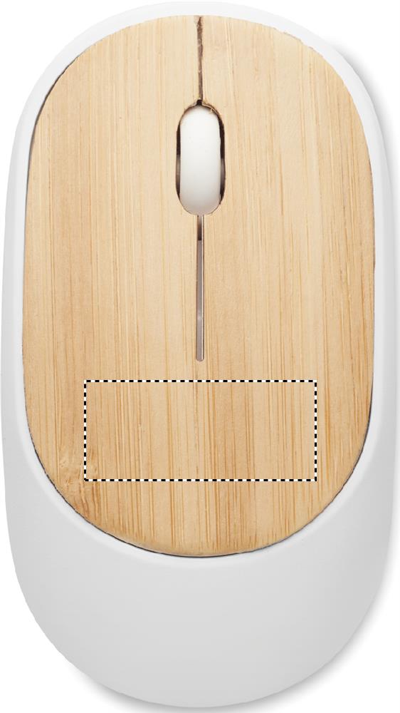 Wireless optical mouse in recycled ABS with bamboo top. 1 AA batteries not included. Bamboo is a natural product, there may be slight variations in colour and size per item, which can affect the final decoration outcome.