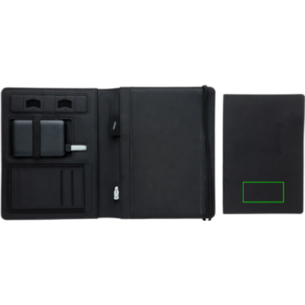 See märkmiku kaas võimaldab teil koosolekuid stiilselt pidada. Esikaanel on juhtmevaba laadimisalus teie nutitelefoni jaoks. (Androidi uusimad põlvkonnad, iPhone 8 ja uuemad). Vanemaid telefone ja tahvelarvuteid saab laadida USB-portide kaudu välise 5000 mAh toitepangaga. Sisend: 5,0V/2,1A. Väljund 1: 5,0V/2,1A. Väljund 2: 5,0 V/2,1 A. Juhtmeta väljund: 5 W. Registreeritud disain®
