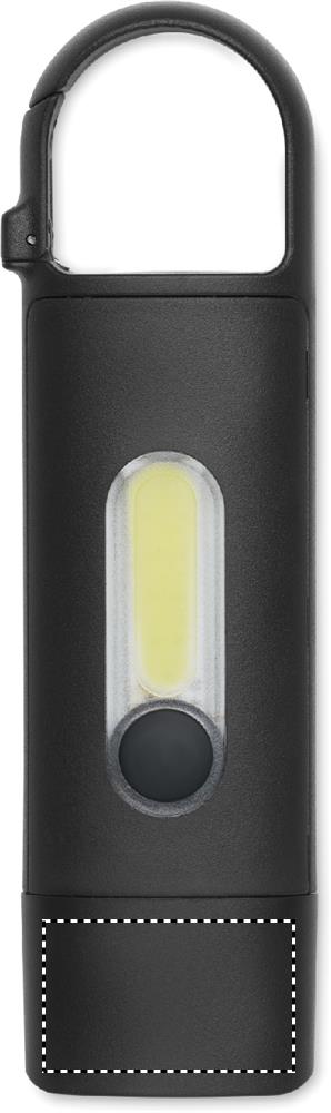 Taskusuurune taaslaetav COB-välklamp ABS-karabiinhaagiga. Hädavalgustus ja 3 valgustusrežiimi. 1 × 3,7 V, 200 mAh taaslaetav liitiumaku (kaasas, ei ole vahetatav).