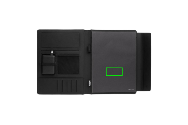 See A4 portfell pakub juhtmevaba laadimise võimalust. Kaasasolevat välist toitepanka saab kasutada ka iseseisvalt. Stiilses portfellis on sisseehitatud juhtmevaba laadimistelefoni alus, elastne pliiatsiaas, kolm visiitkaardihoidikut ja lisataskud. Märkmikus on 20 lehte (80 gsm) kreemikat joonelist paberit. Valmistatud polüestri ja PU-naha segust. Sisend: 5V/2A; Väljund: 5V/2A. Juhtmeta sisend 5V/2A, väljund 5V/1A. Saadaval täisvärvilises kinkekarbis.