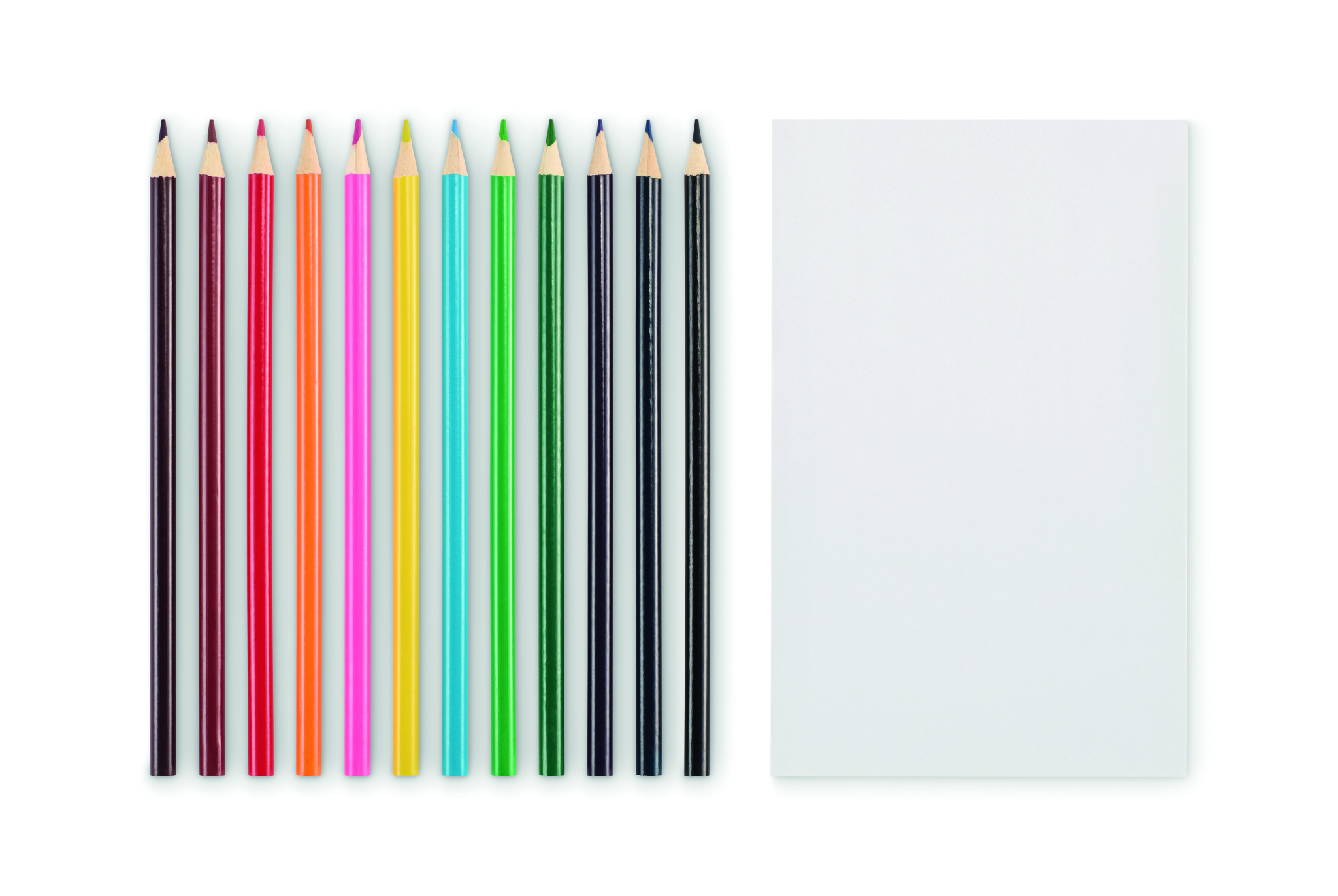 Laste joonistuskomplekt 50 ümbertöödeldud paberilehe ja 12 puidust värvipliiatsiga. Jõupaberist kaantega.