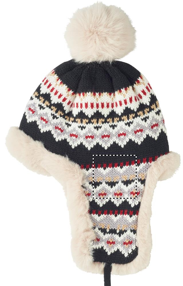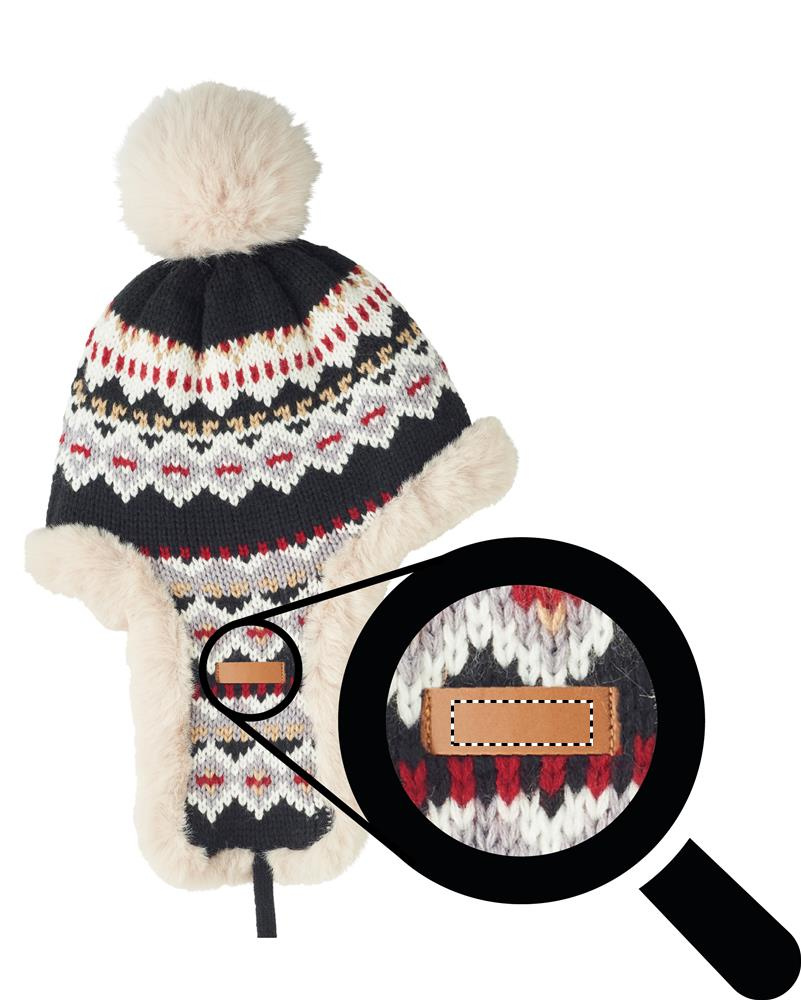 Kootud akrüülkiust müts kõrvapealsete klappide ja tutiga, polüestri ja fliisiga vooderdatud. Ühel küljel on embleem trükialaga. Täiskasvanute suurus.