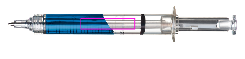 Süstlakujuline pliiats, sinise või punase plastikust täidisega. Trükime teie logo musta värviga, skaala vastas.
