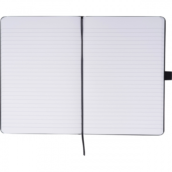 A5-kokoinen muistikirja, jossa on PU-kansi, kirjanmerkki, joustava suljinnauha, kynänlenkki ja 120 viivoitettua sivua kivipaperista. Tämä erikoispaperi on valmistettu kalsiumkarbonaatista ja se on öljyn- ja vedenkestävää, antistaattista, rakeetonta, palonestoainetta ja mikä tärkeintä, repeämätöntä. Logosi on painettu kannen ulkopuolelle.