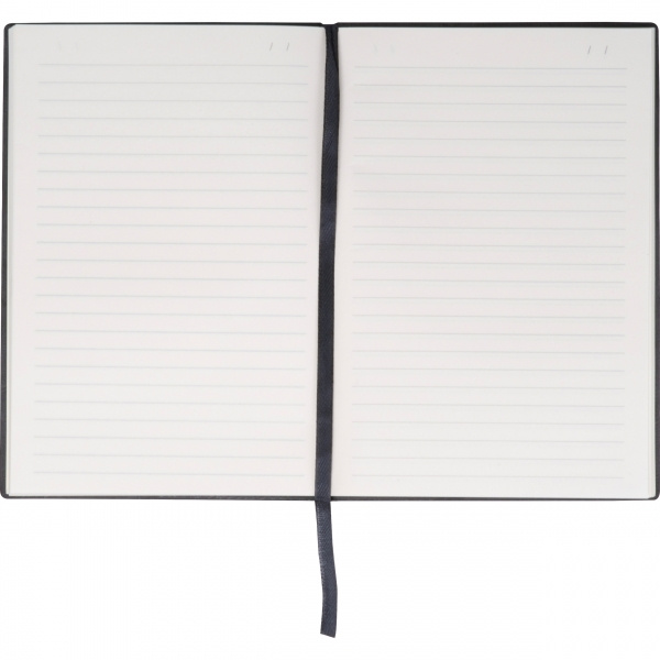 A5-kokoinen muistikirja, jossa on joustavat pehmeät PU-kannet, kirjanmerkki ja 192 viivoitettua sivua kierrätyspaperista. Logosi on painettu kanteen punotun alueen alapuolelle.