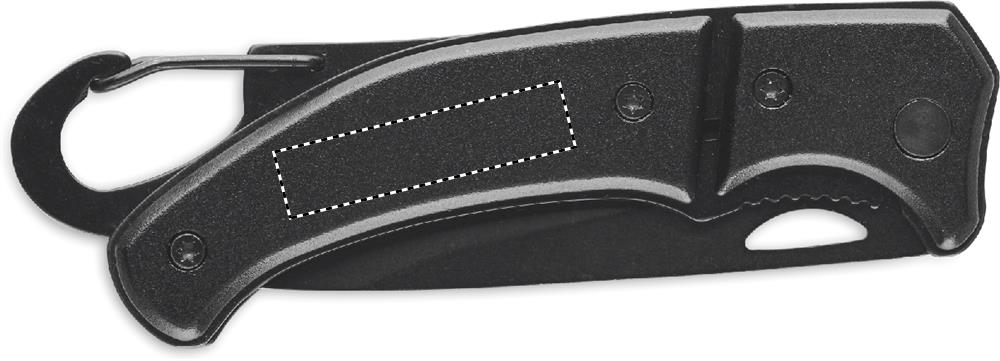 Alumiininen taitettava veitsi karabiinilla. Terä ruostumatonta terästä. Karabiini ei ole tarkoitettu kiipeilyyn (ei-ammattikäyttöön).