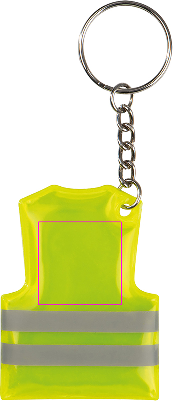 Turvaliivin muotoinen avaimenperä heijastavilla raidoilla. Painamme logosi raitojen yläpuolelle.