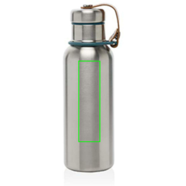Ruostumattomasta teräksestä valmistettu vesipullo on tyylikäs tyhjiösuljettu pullo, joka pitää juomat kylmänä 24 tuntia tai kuumana 12 tuntia. Korkki on myös täysin ruostumatonta terästä, joten vesi ei pääse kosketuksiin muovin kanssa. Keinonahkainen kantolenkki toimii viehättävänä yksityiskohtana. Vain käsinpesu