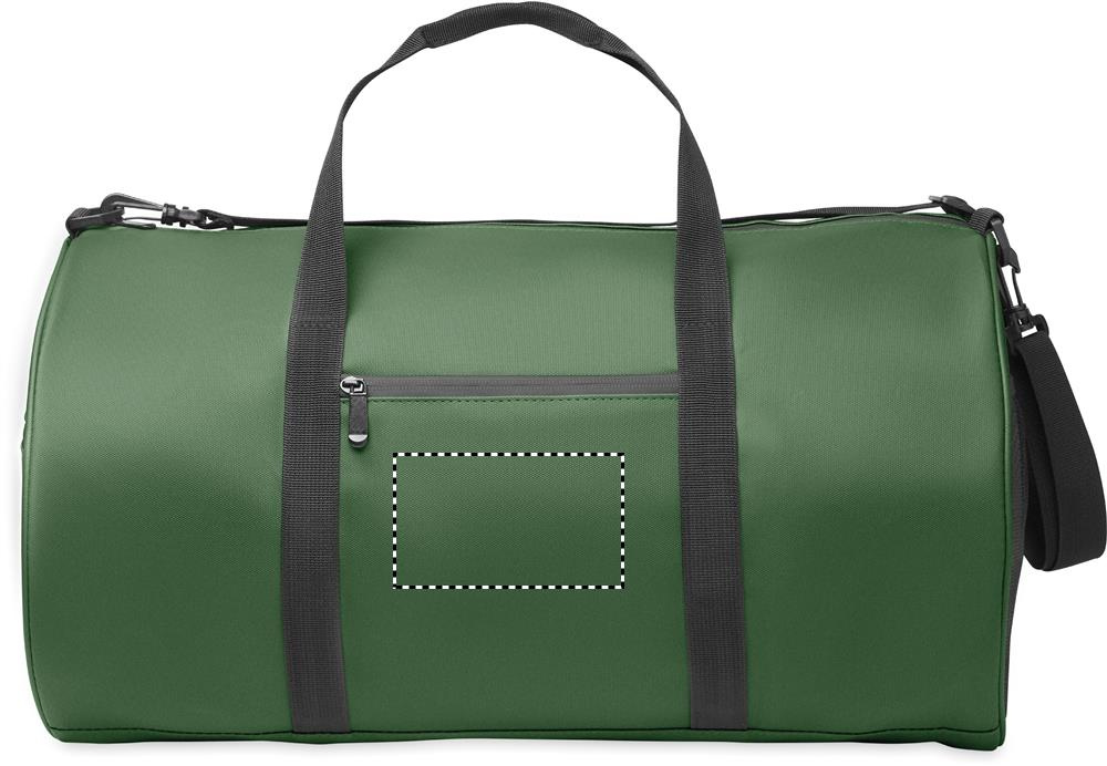 Duffelilaukku 600D RPET -polyesteriä PU-pinnoitteella. Vetoketjullinen etutasku. Sisällä 210D RPET -polyesterivuori. Yksi vetoketjullinen sivutasku / yksi sivuverkkotasku. Vetoketjullinen sisätasku.