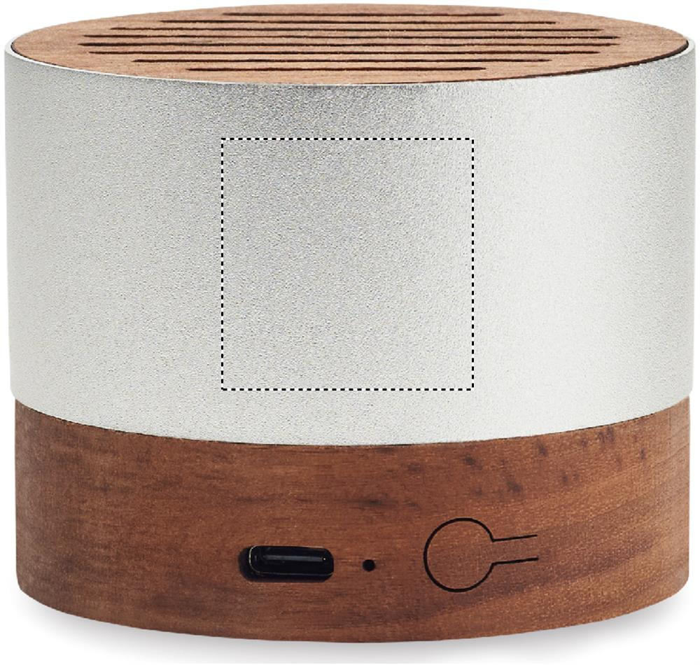 5.3 langaton kaiutin kierrätetyssä alumiinikotelossa pähkinäpohjalla ja yksityiskohdilla. Mukana 1 ladattava Li-ION 300 mAh akku. Lähtötiedot: 3W, 3 Ohm ja 5V. Peliaika n. 3h.
