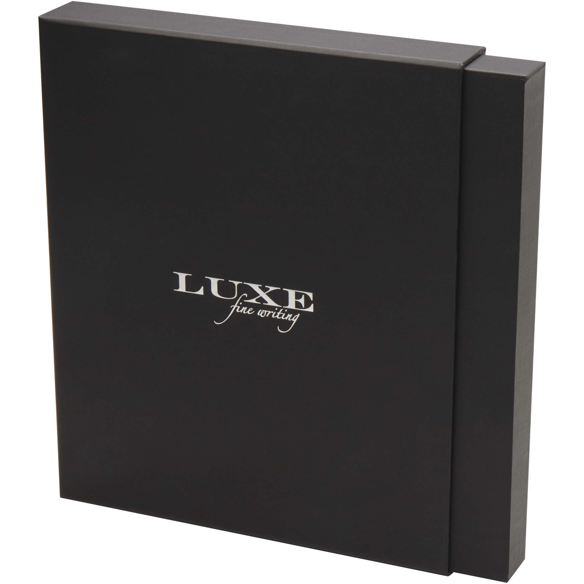Legato on tyylikäs A5-kokoisen muistivihkon ja kuulamustekynän yhdistelmä. Kynässä on RCS-sertifioidusta messingistä valmistettu rungon yläosa hopeakromatulla pinnoitteella. Rungon alaosa on maalattu ruiskumaalilla, ja siinä on metalliset hopeakromatut yksityiskohdat sekä LUXE-logo keskiosan renkaassa. Musteen väri: Sininen. Kirjoituspituus: 400 metriä. Lyijyn paksuus: 0,7 mm. Mukana musta täyttöpakkaus. Muistivihkossa on 80 viivoitettua kermanväristä arkkia, jotka on valmistettu 80 g/m²:n paperista, kierrätetystä muovista valmistettu nahkamainen kansi, kuminauhasuljin, nauhakirjanmerkki ja haitaritasku. Hopeakromattu metallinen yksityiskohta kuminauhasulkimessa. Toimitetaan pahvisessa lahjapakkauksessa.