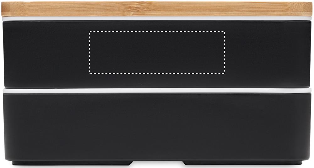 Kierrätetystä PP:stä valmistettu kaksikerroksinen lounaslaatikko, jossa on irrotettava väliseinä ja 3 ruokailuvälinettä, kiinnitettävä polyesterinauha ja bambukansi. Kannessa on puhelinteline. Tilavuus: 400 ml (2x).