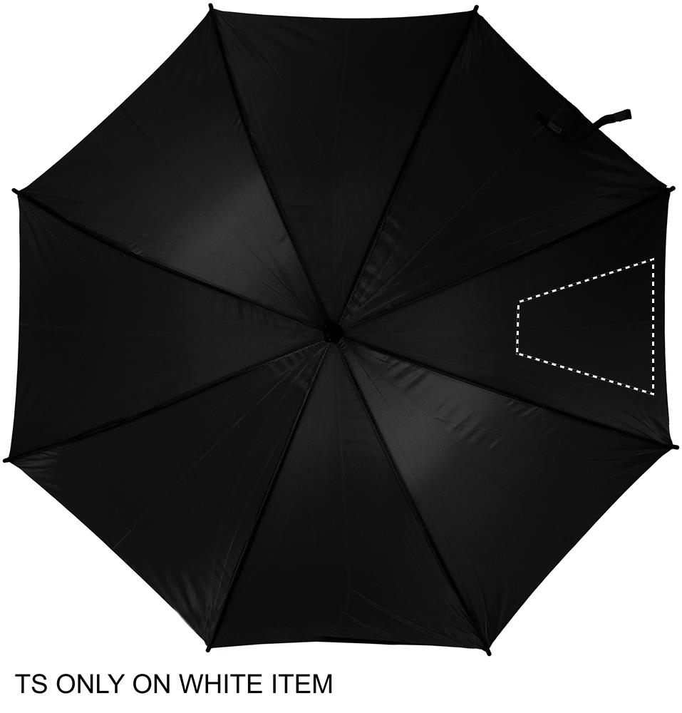 Manuaalisesti toimiva 23 tuuman sateenvarjo, 190T polyesteriä. Puinen varsi, kärjet ja yläosa. Mustat päällystetyt metallisissa ruoteissa, kaareva puukahva ja manuaali suljin.