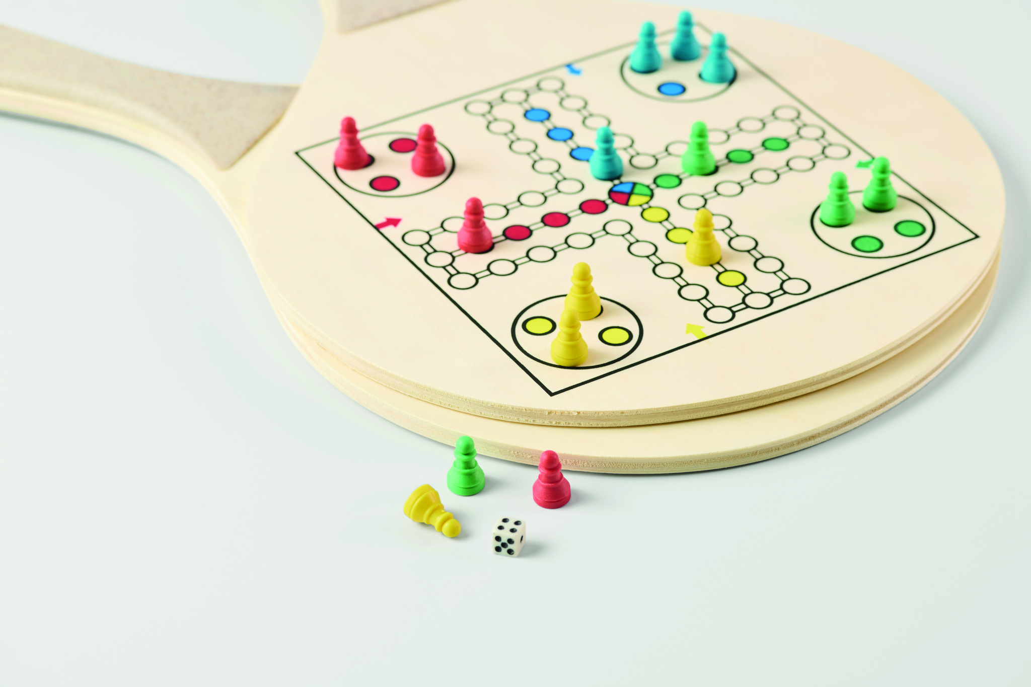 Beach set with 2 plywood rackets featuring a chess and ludo game boards. Includes 1 TPR ball, dice and checkers. Packed in RPET mesh zippered carrier bag.