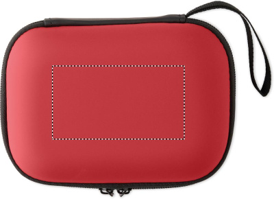 First aid kit in hard PU case. Includes 2 gloves, 1 blanket, 1 tape, 2 bandages, 1 scissors, 4 swabs, 10 plasters and 6 cleaning wipes. Not available for sale outside the EU.