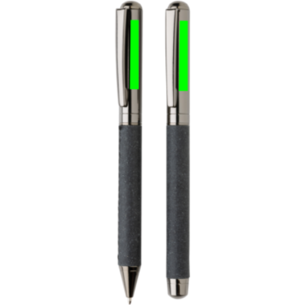 Этот красивый набор ручек изготовлен из переработанной кожи. Набор имеет элегантный дизайн цвета оружейной стали, он стильный и идеально подходит для записи ваших заметок в стиле. Он содержит шариковую ручку и ручку-роллер. Каждая ручка включает синие чернила Dokumental. Длина письма для ручки составляет 1200 метров, а для ручки-роллера — 400 метров. Набор ручек поставляется в чехле из переработанной кожи и подарочной коробке с принтом в виде переработанной кожи.