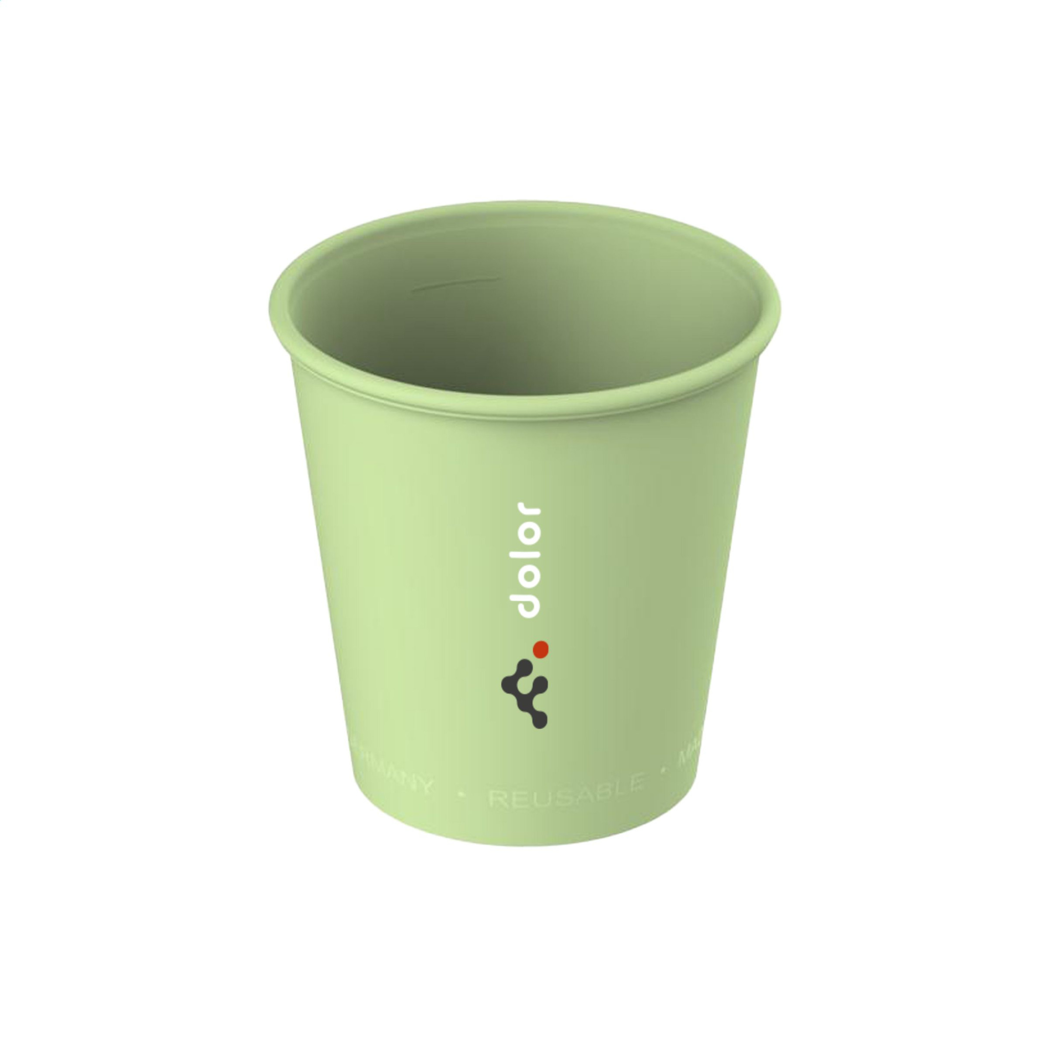 Многоразовый стакан для питья из пластика. Отлично подходит для использования в качестве стандартного многоразового стакана с кофемашиной. Идеальная альтернатива одноразовому кофейному стакану. При переходе на многоразовый стакан в отходы попадает на миллиарды меньше стаканов. Этот красивый стакан на 100% пригоден для вторичной переработки, не содержит бисфенол А и может штабелироваться. Емкость 200 мл. Сделано в Германии. Минимальный заказ 100 штук одного цвета.