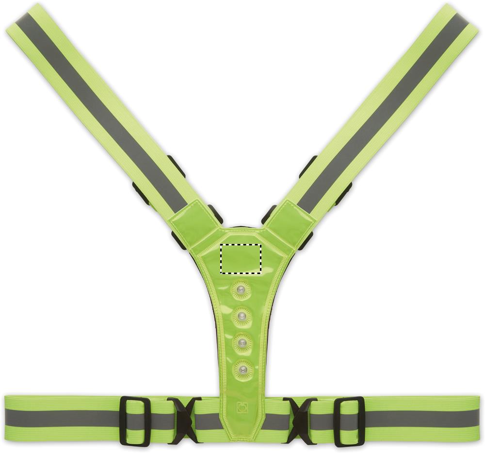Регулируемый 360° светоотражающий пояс с 4 светодиодами спереди и 4 светодиодами сзади и серебристыми полосками. В комплекте 2 батарейки CR2032. Только для рекламного использования.