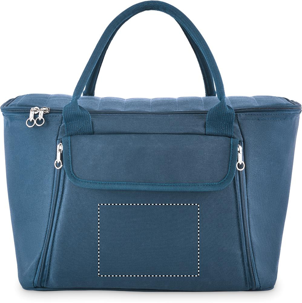 Picnic cooler bag in 600D RPET polyester for 2 people with zippered front pocket including stainless steel cutlery, 2 plates in PS, 2 glasses in PS and 2 cotton napkins. Capacity: 18l