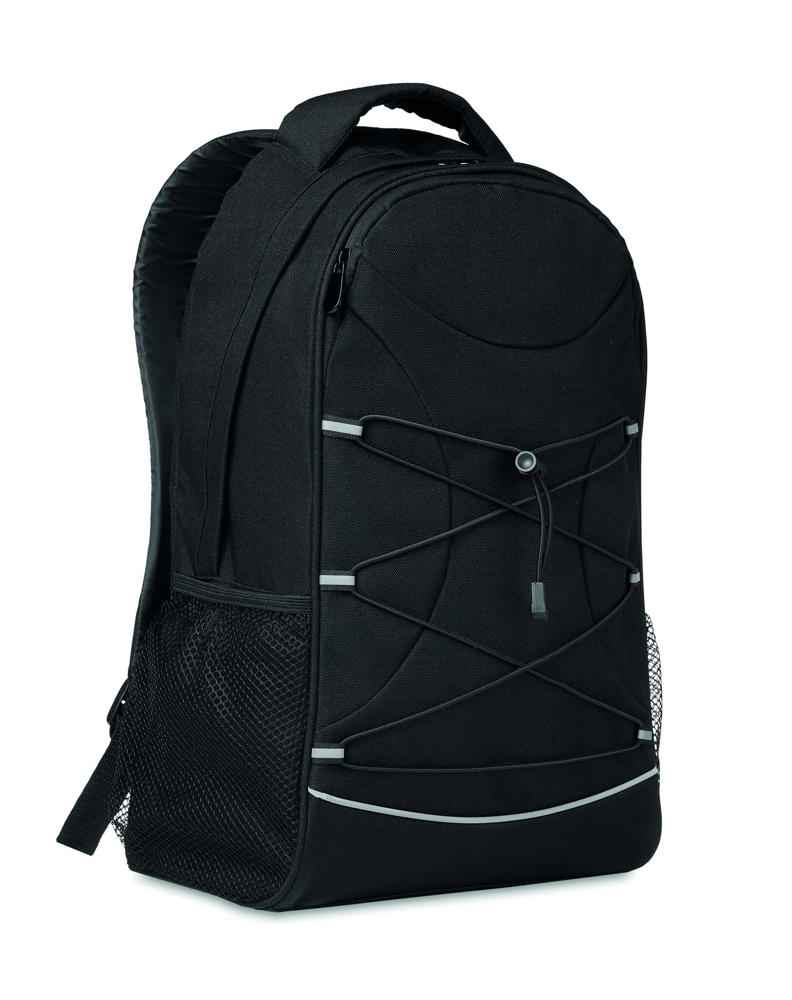 Рюкзак из RPET 600D с темными шнурками спереди и светоотражающей передней панелью. Сетчатые карманы с двух сторон.
