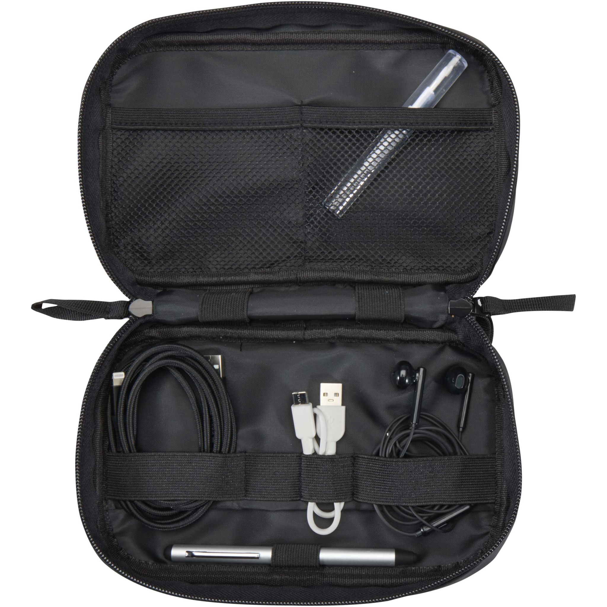 Эта сумка для техники, изготовленная из переработанной полиуретановой кожи, сертифицированной согласно GRS, с подкладкой из переработанного пластика PET, предназначена для путешественников, удаленных работников и любителей технологий. Компактная и удобная для переноски в рюкзаке или ручной клади, она имеет основное отделение на молнии с практичными функциями организации пространства, включая эластичную петлю для ручки, два сетчатых кармана для наушников и небольших аксессуаров, усиленный разделитель и несколько эластичных петель для надежного крепления кабелей, USB-накопителей и зарядных устройств. Снаружи имеется передний карман с застежкой-липучкой для быстрого доступа, а также ручка из тесьмы для удобства. Благодаря водостойкому покрытию ваши вещи будут в безопасности, куда бы вы ни отправились. Объем: 1 литр.