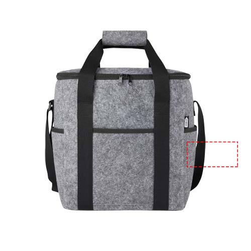 Большая сумка-холодильник, изготовленная из высококачественного мягкого и прочного фетра, переработанного по стандарту GRS. Имеет большое главное отделение (на шесть бутылок 1,5 л), отделанное высокоплотной термической PEVA-изоляцией, совместимой с пищевыми продуктами, позволяющей хранить напитки и закуски холодными на протяжении нескольких часов. Верхняя часть с застежкой на молнии, передний карман и два боковых кармана для дополнительной вместимости. Длинные регулируемые тканые плечевые ремни из хлопка (55 x 3,8 см) и 2 тканых хлопковых ручки для переноски (25 x 3,8 см) с верхней застежкой на липучке. Легко чистится. Емкость: 21 литр.
