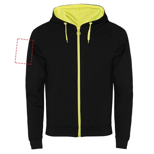 Толстовка из флиса без начеса с деталями флюоресцентного цвета. Центральная молния с контрастным бегунком. Капюшон с подкладкой из микроперфорированной полиэфирной ткани контрастного флюоресцентного цвета. Шнурок и металлические люверсы контрастного флюоресцентного цвета. Манжеты и талия в рубчик 1х1. Два передних кармана с широкой окантовкой. Усиленные закрытые швы на внутренней части воротника. Съемная этикетка.