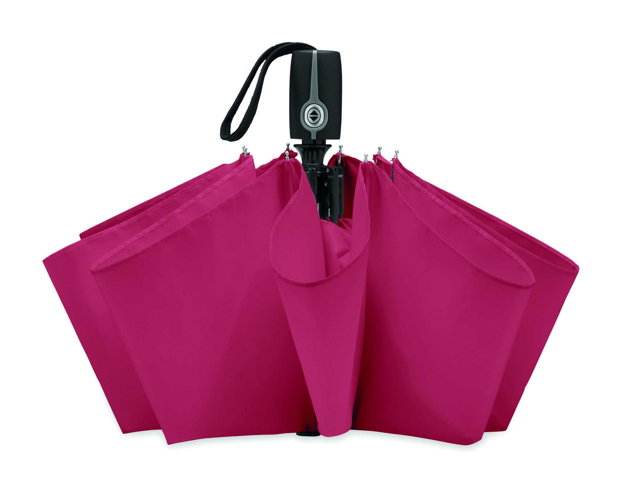 Зонт автомат в 3 сложения, устойчивый к ветру с металлическим стержнем, хромированным наконечником и черной прорезиненной ручкой. Длина в сложенном виде 21 см.