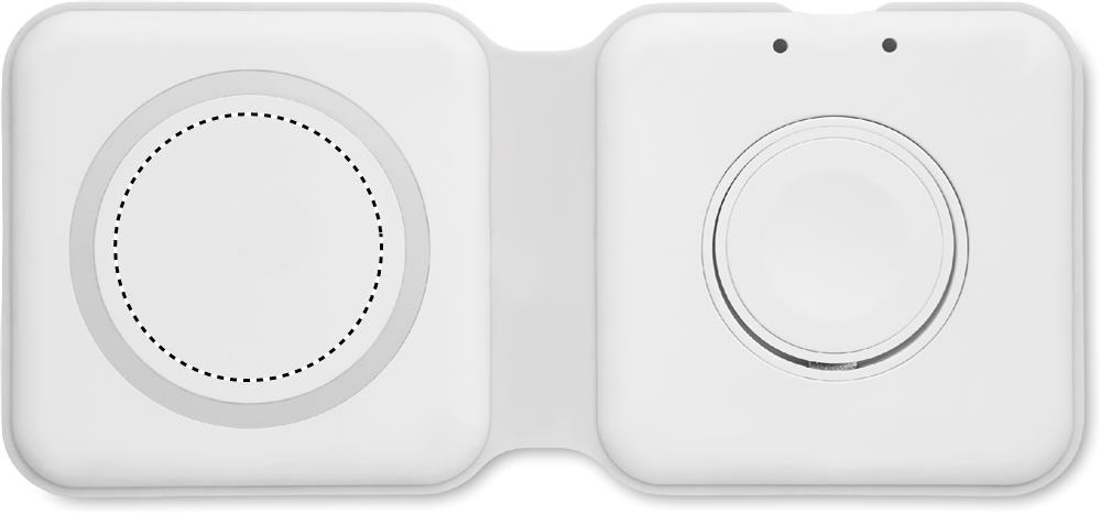 2 i 1 hopfällbar laddningsstation i ABS. Den innehåller en trådlös laddare på 15 W och en laddare för smartklockor (endast Apple®).