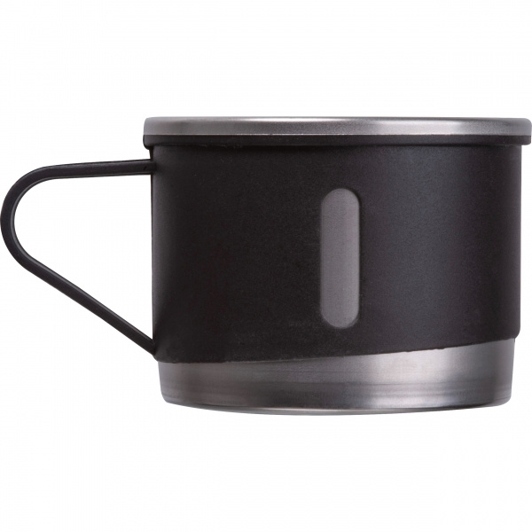 Set med isolerade flaskor bestående av en dubbelväggig isolerad flaska i rostfritt stål (400 ml) med snabbkoppling och tre rostfria dricksmuggar (120 ml) med plastbeläggning. Din logotyp appliceras på flaskan med lasergravyr.
