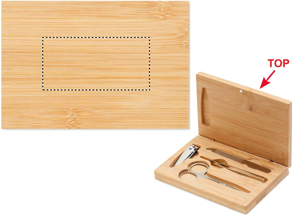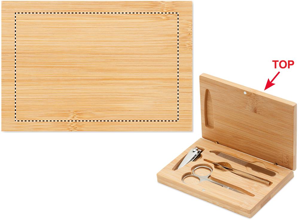 4-delat manikyrset i rostfritt stål i ett bambufodral med magnetisk stängning. Innehåller: böjd nagelsax, nagelklippare, nagelfil och pincett.