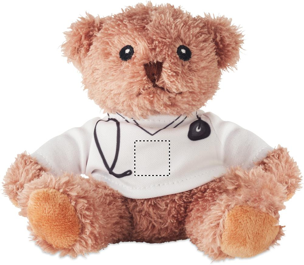 Nallebjörn av polyester klädd som läkare med vit T-shirt med tryck. Broderade ögon, näsa och mun.