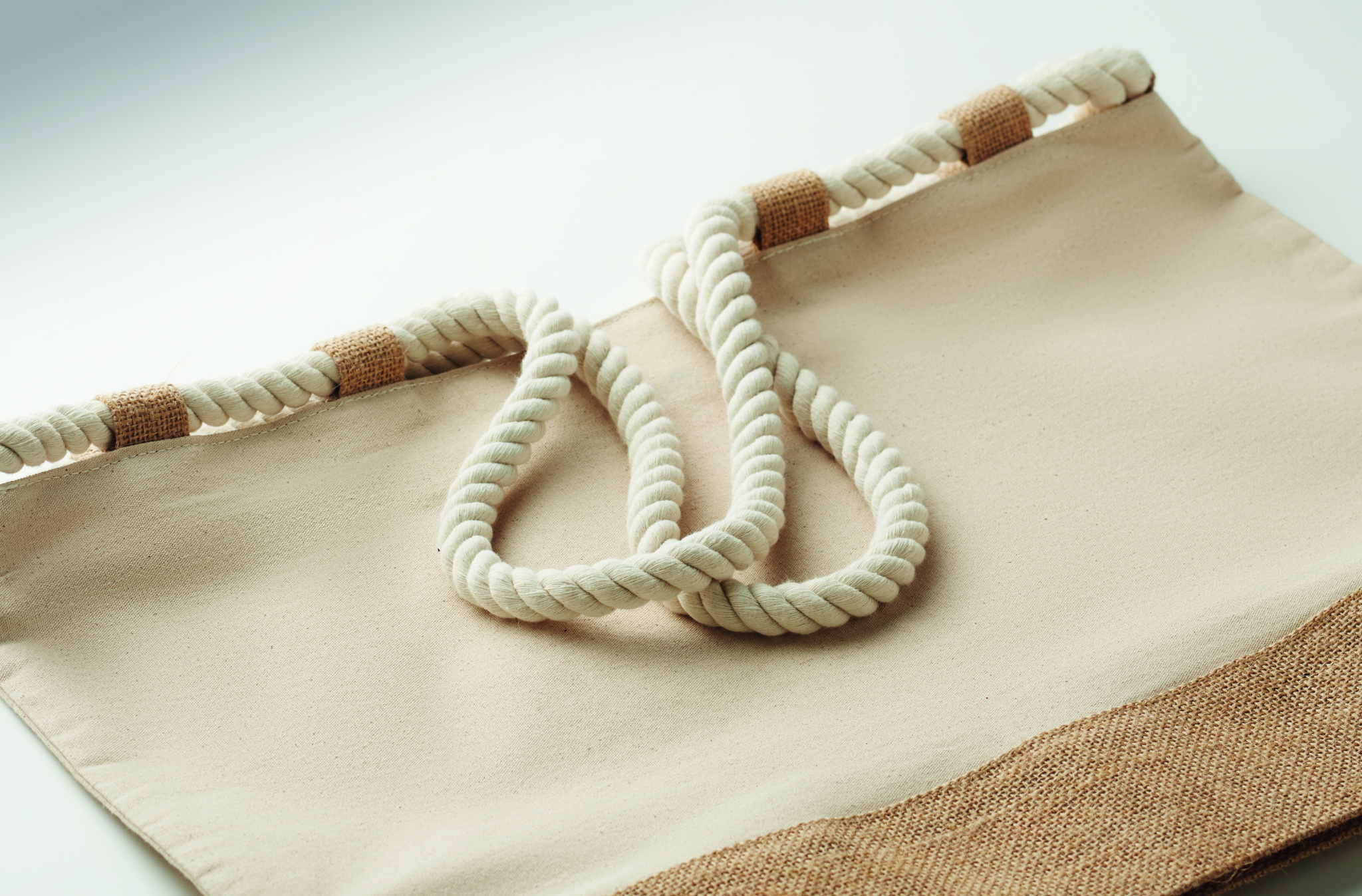 Strandväska i 280 gr/m² bomullscanvas i sidorna och botten i jute samt stägning med dragkedja. Rephandtag som fästs i 10st små jute öglor.