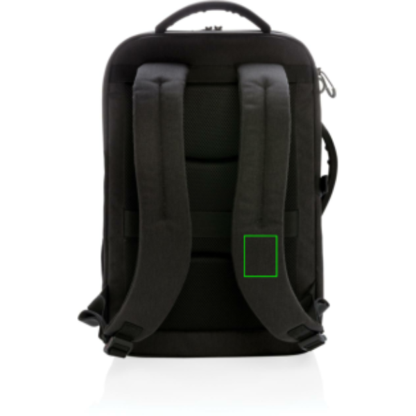 Reseryggsäck som passar både som handbagage på flyget och för en weekend-resa. Vadderat laptopfack med plats för 17" laptop. Med kapacitet som en trolley utan den extra vikten från handtag och hjul. Dessutom reser man smidigt med en ryggsäck. Med bagagerem, sidofack för vattenflaska och USB output. Toppfack med enkel åtkomst, blixtlåsförsett frontfack och RFID-skyddade fack. Med AWARE™ spårämne som validerar användandet av genuint återvunna material. 2% av intäkterna för varje såld Impact-produkt kommer att doneras till Water.org. PVC-fri.