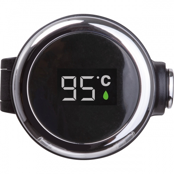 Vakuumisolerad flaska i rostfritt stål med temperaturdisplay i locket och säkerhetslås. Maximal temperaturdisplay: 99°C. Din logotyp appliceras på flaskan med lasergravyr.
